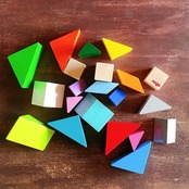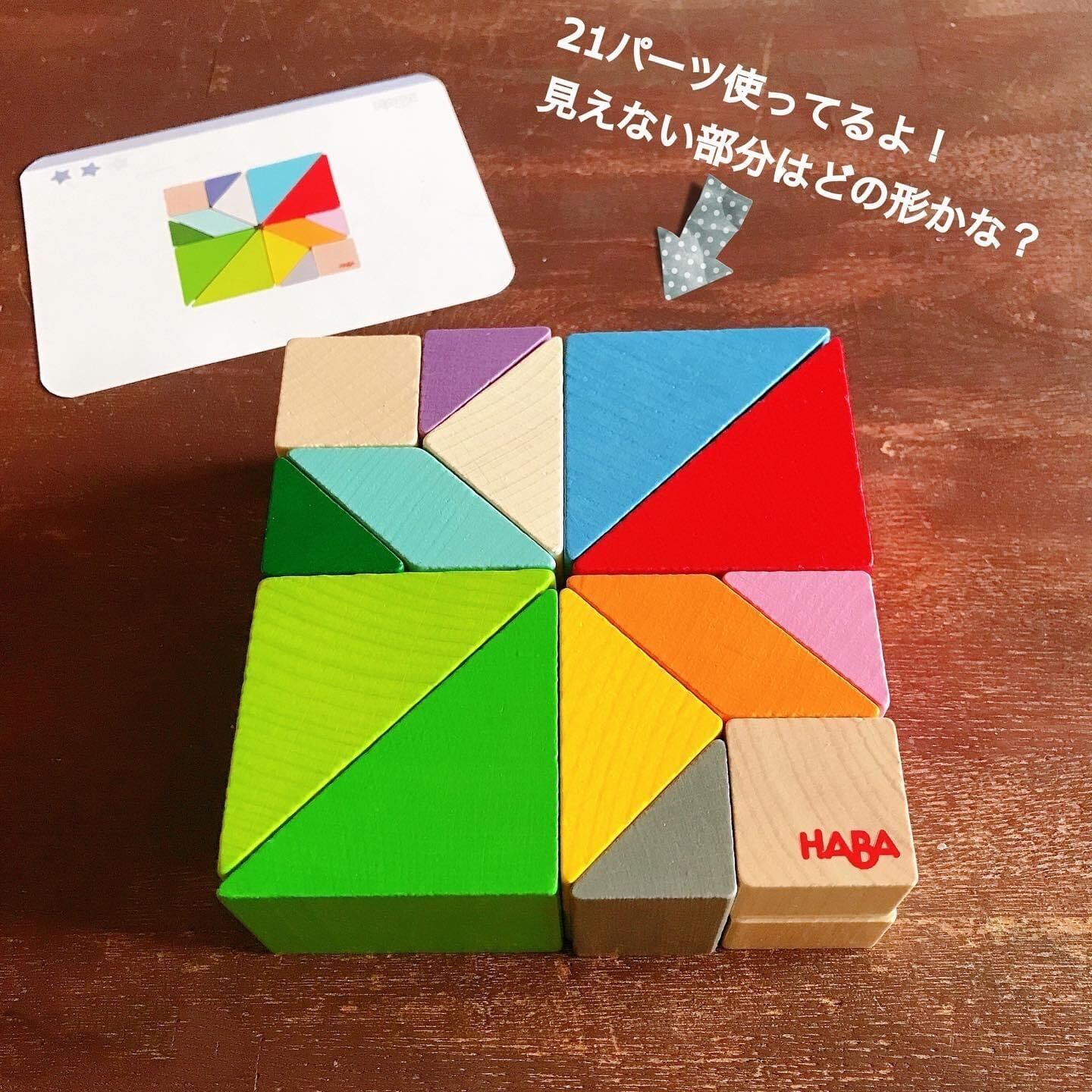 21個のパーツの組み合わせで3組のタングラムが作れます。すべて積むと一辺10cmの立方体ができ上がります。