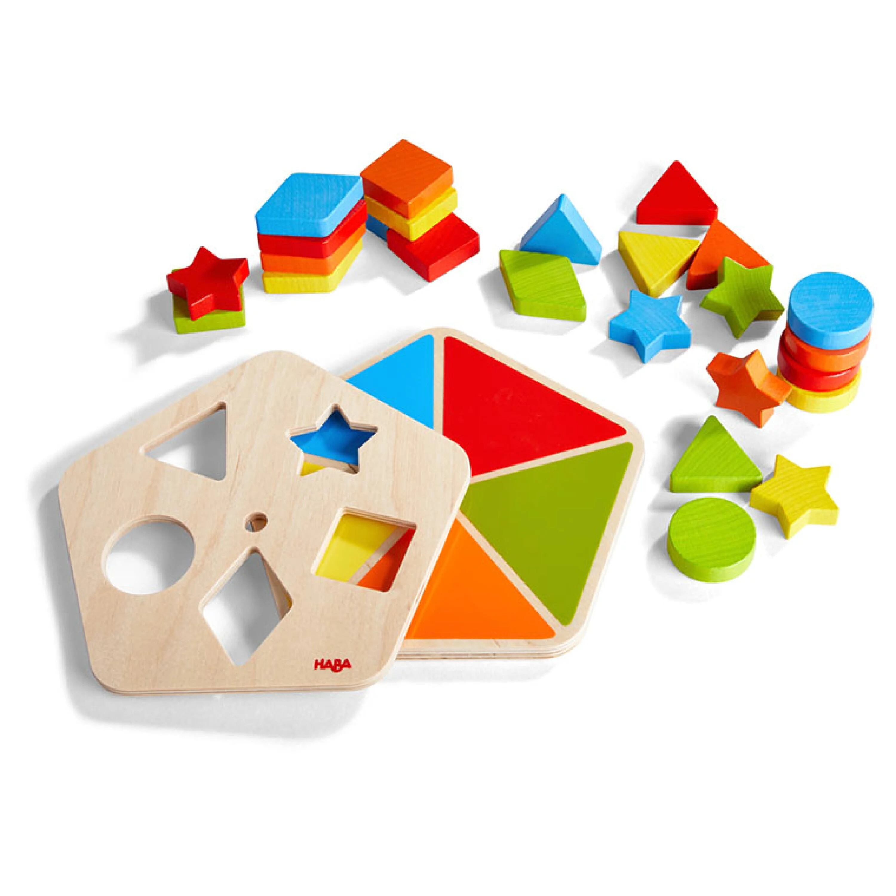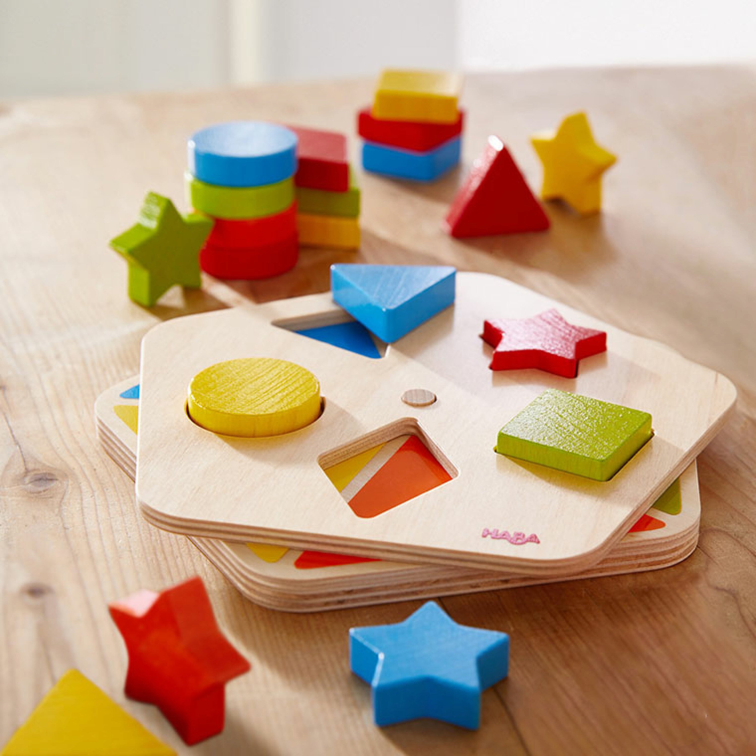 5色5種類のパーツを同じ色、形にはめるパズルのおもちゃ。